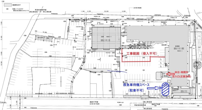 また工事に伴い、夜間救急入口が封鎖になります。工事期間中の時間外や休日等の出入りは正面玄関となりますのでご了承ください。ご不明な点はお近くのスタッフにお尋ねください。